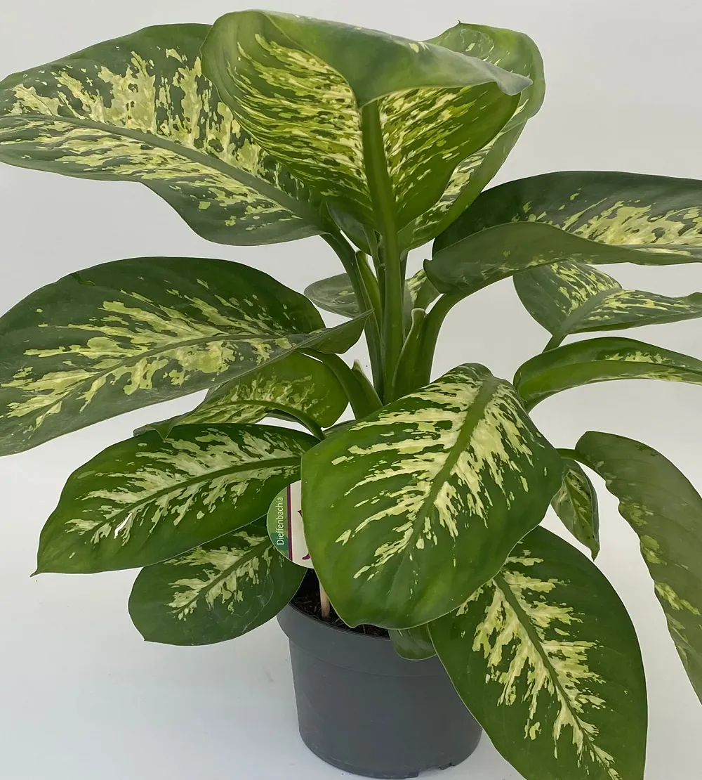 La dieffenbachia (Dieffenbachia amoena, D. picta) è una splendida pianta tropicale d’appartamento amata per le grandi foglie variegate, spesso quasi bianche con bordi o righe verdi o vistose maculature. Può raggiungere altezze di 1 metro e più, con foglie lunghe anche più di 30 cm.